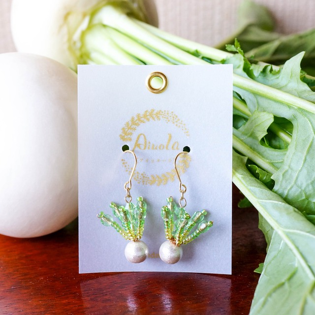 白いお肌と葉っぱのコントラストがまぶしい、白かぶらです。 全体的に明るく、赤・青・白のかぶらの中でいちばん蕪らしいのがこの白かぶらです。 かぶら本体は真っ白なコットンパールを使用しています。 透き通ったペリドット&ゴールドラインのチェコビーズを葉っぱ部分にあしらいました。 茎部分にはペリドット~ライム色のグラデーションが入っています。 中央にはグリーンカラーのスワロフスキービーズが入っているので、さりげなくきらっとします。 葉っぱの部分は手づくりのオリジナルパーツです。 ワイヤーを手作業で編み込み、リアルな葉っぱの形を表現しています。 漬物から煮物までさまざまに活用されるかぶらたち。 ぜひ耳元で遊ばせてやってください。 素材:コットンパール チェコビーズファイアポリッシュ ガラスビーズ アーティスティックワイヤー サイズ:モチーフ部約3㎝ ピアス金具はサージカルステンレスピアス、樹脂ピアスがお選び頂けます。 またお値段が上がりますが14Kgfのピアス金具にも変更可能です。 (モチーフとつなぎパーツ素材は14Kgfにはなりません) ネジバネ式イヤリングをご選択いただいたお客様には耳にやさしいシリコンカバーをサービスさせていただいております。 ピアスをお選びのお客様にはシリコンキャッチをサービスさせていただいておりますので、落としにくく安心です。 〇お取り扱いについて アーティスティックワイヤーで制作しております。 強い力を加えますと曲がってしまいます。 また、葉の部分も柔らかめのワイヤーになっております。 優しいお取り扱いをどうぞよろしくお願いいたします。 ひとつひとつ手作業で造形しておりますので、左右対称にならないこともございます。 どうぞご了承ください。