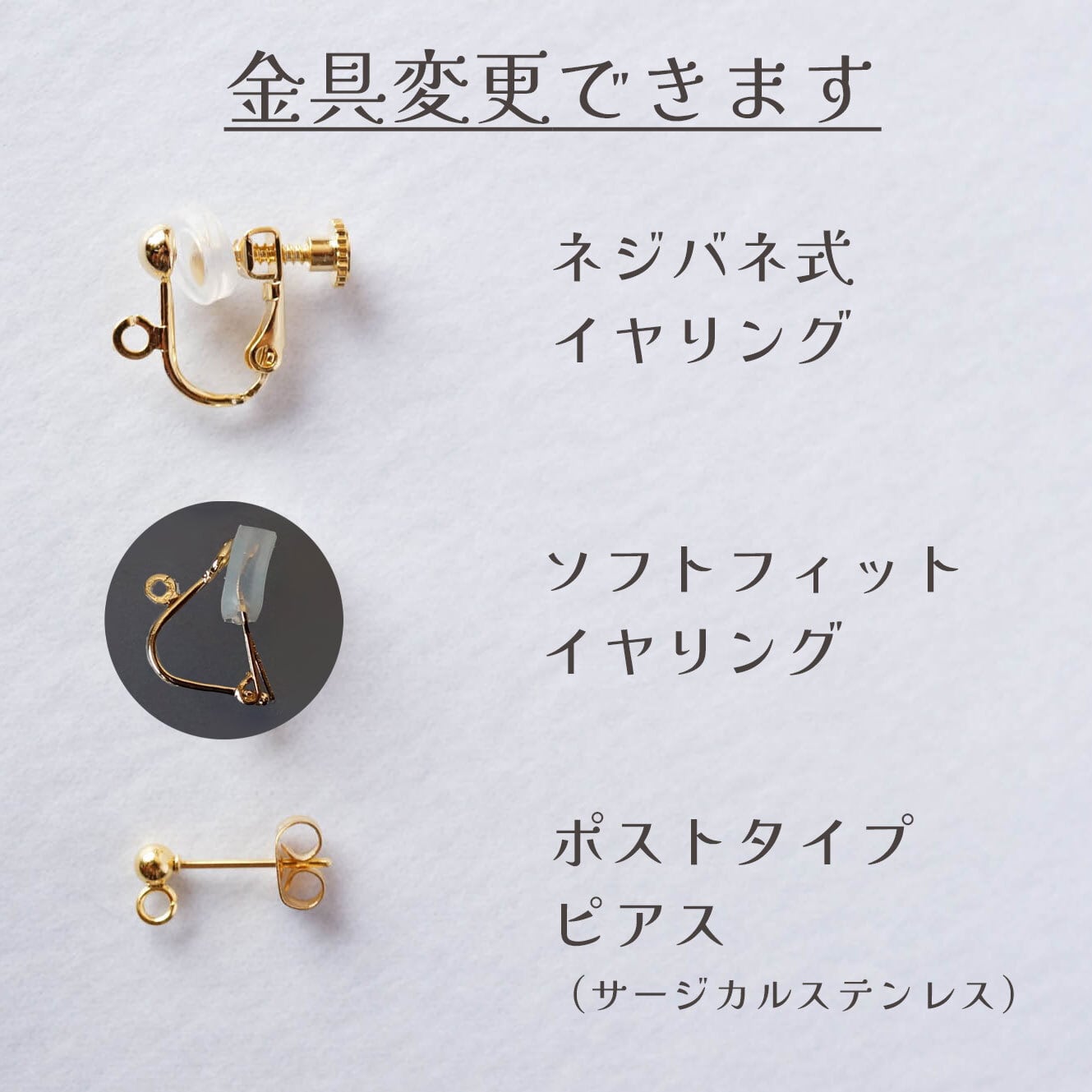 イヤリング金具は2種類、ネジバネ式・ソフトフィットイヤリングが選べます。