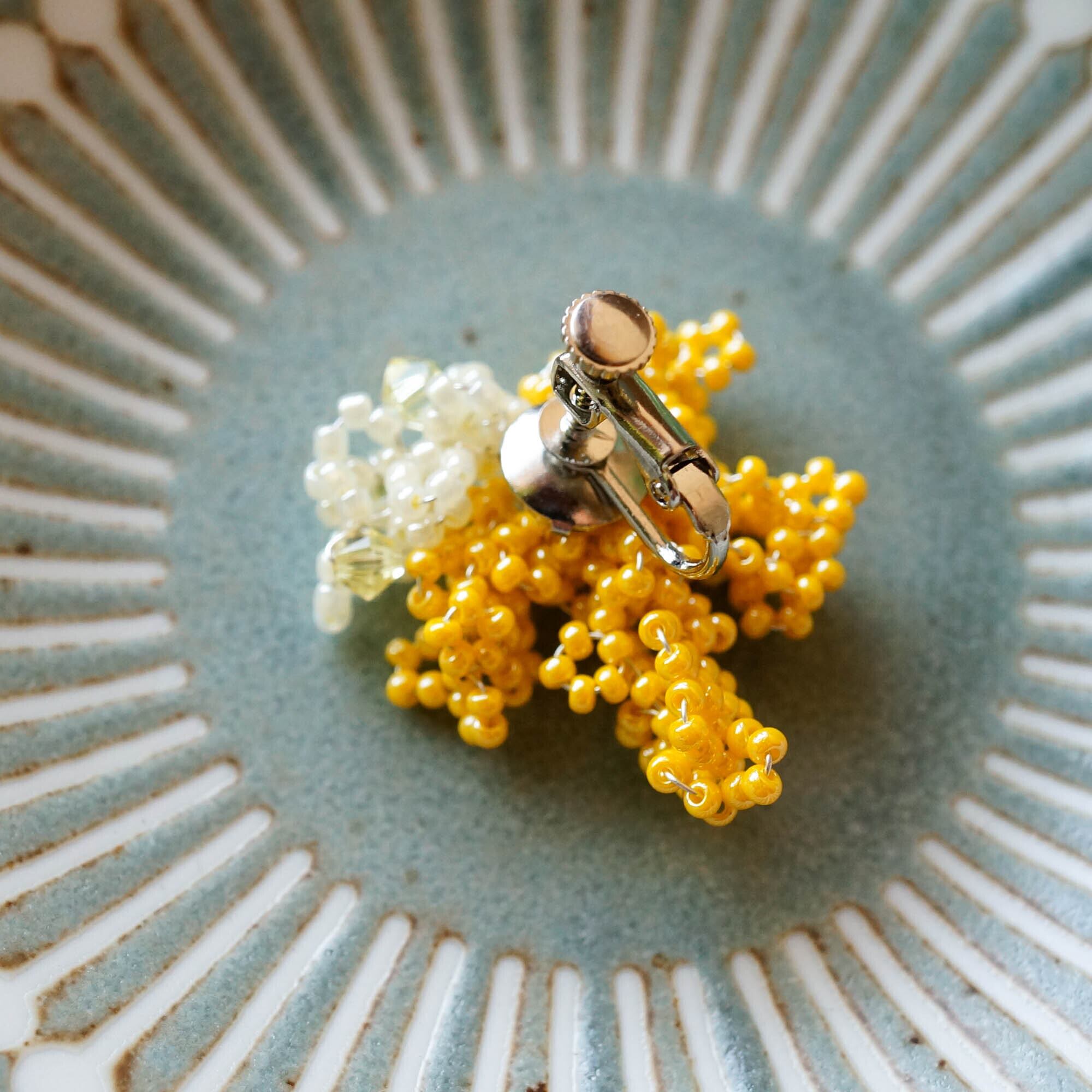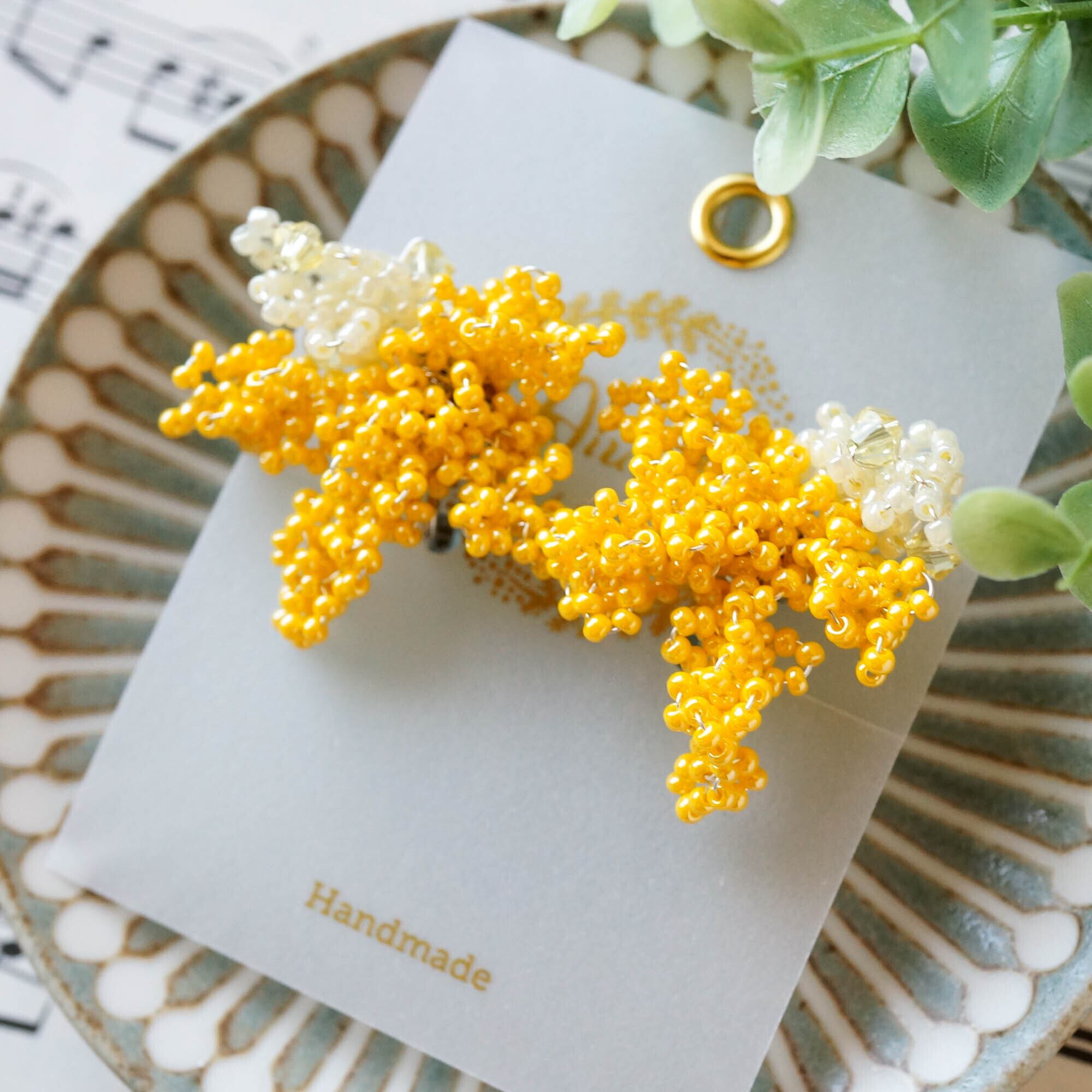 つやつやとした明るいイエローと淡いクリーム色のコントラストが特徴的です。ふんわりとしたボリューム感があり、耳元を鮮やかに演出します。