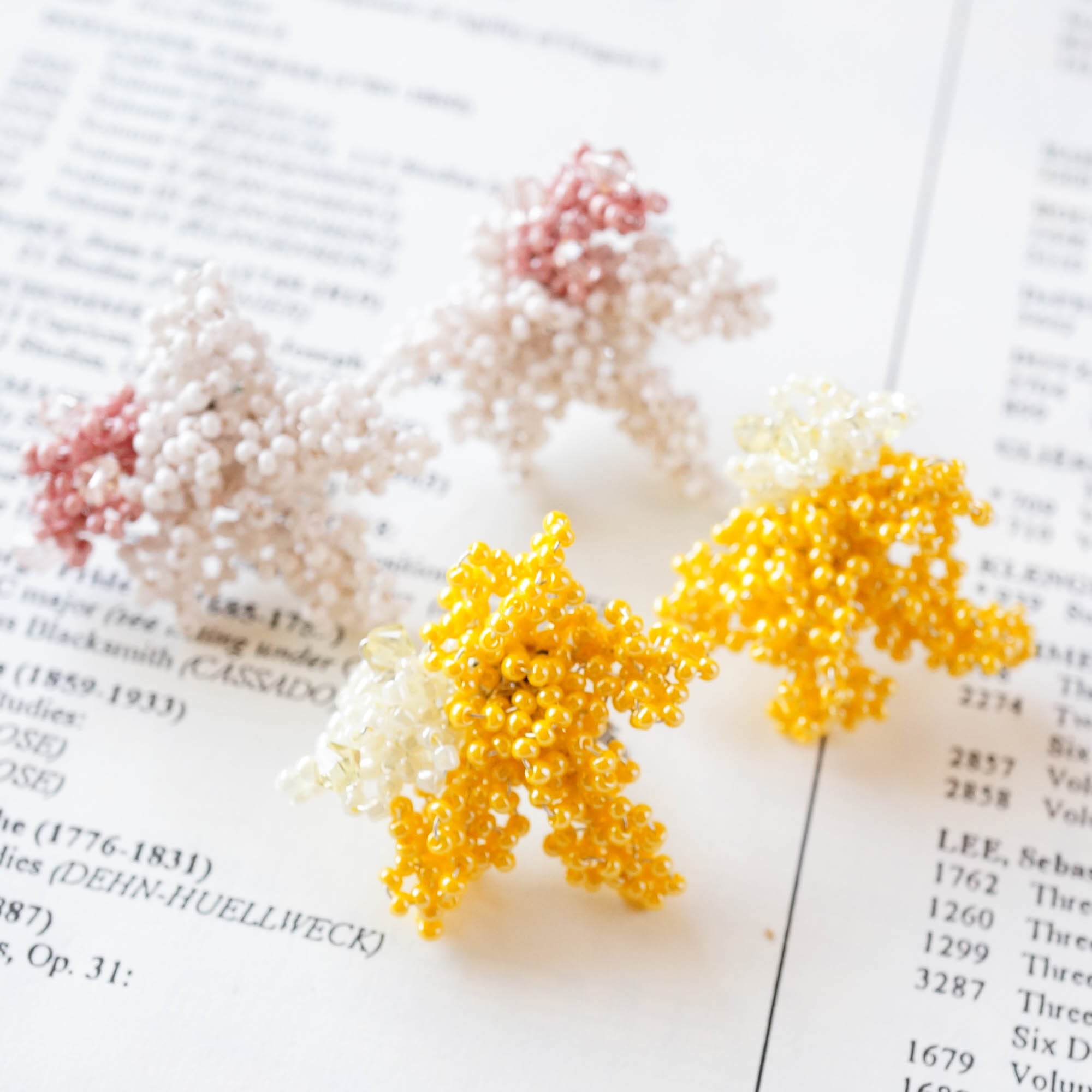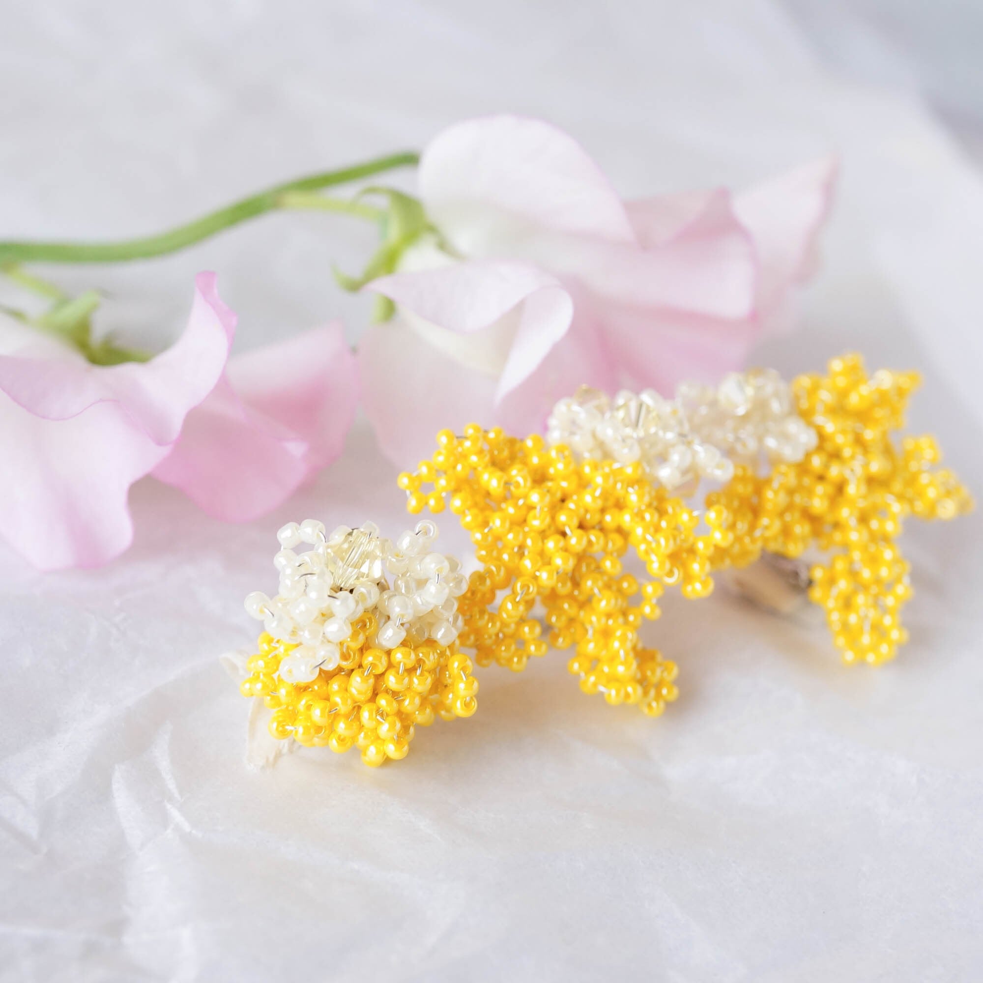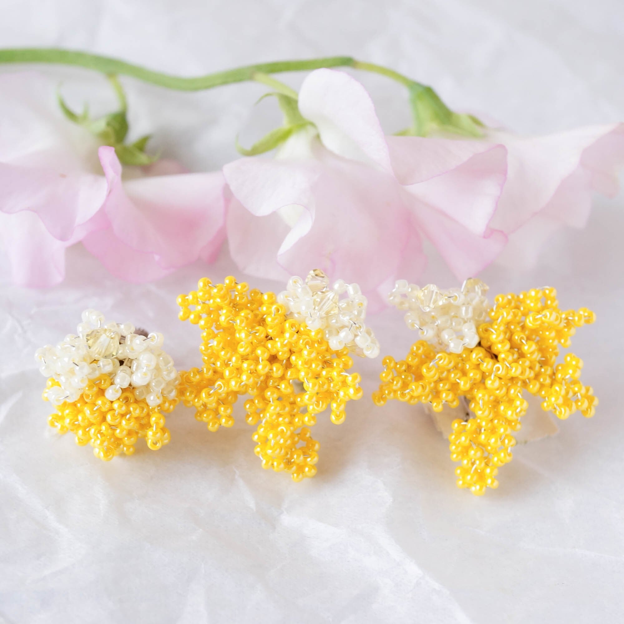 モチーフに使われているビーズはなんと片耳300粒以上。