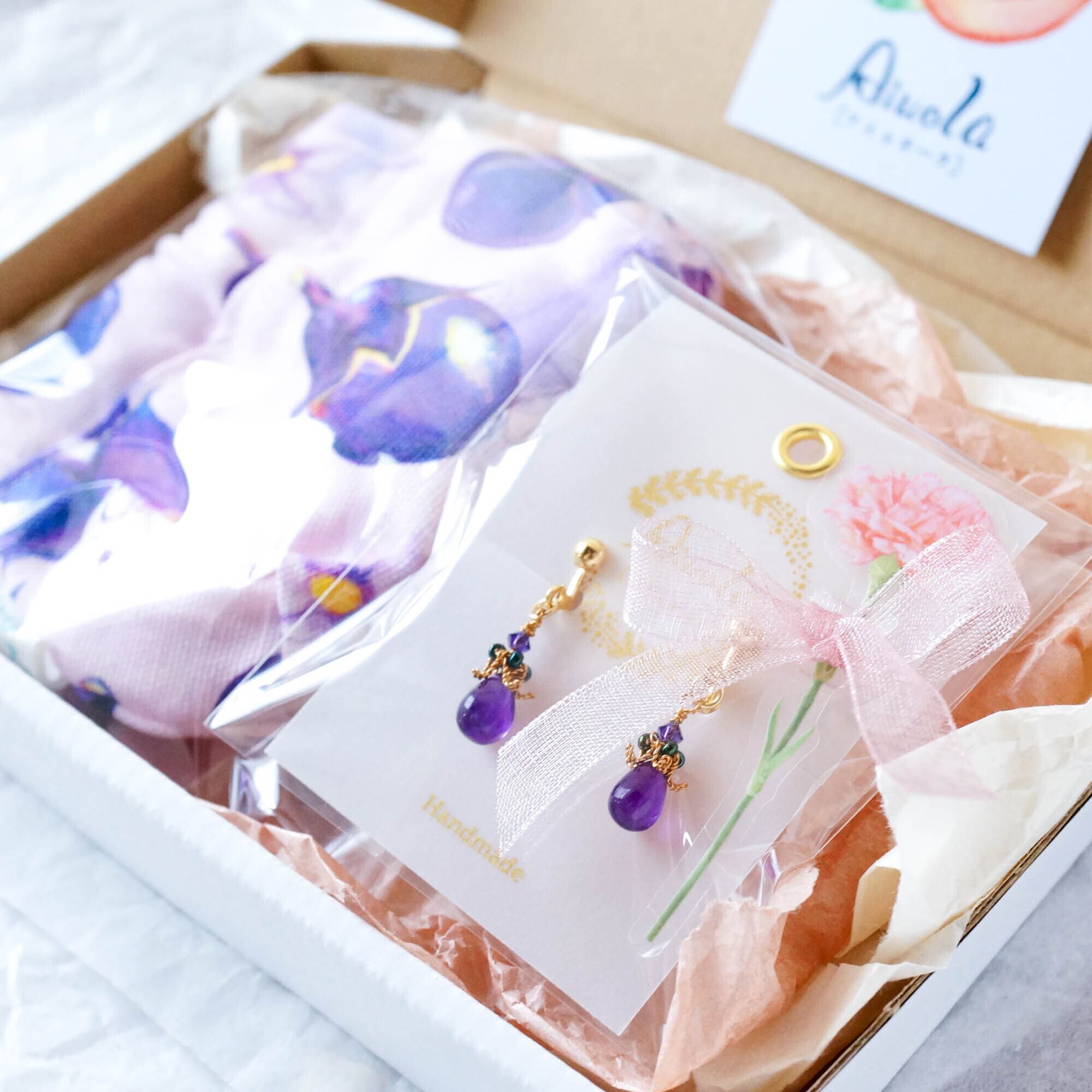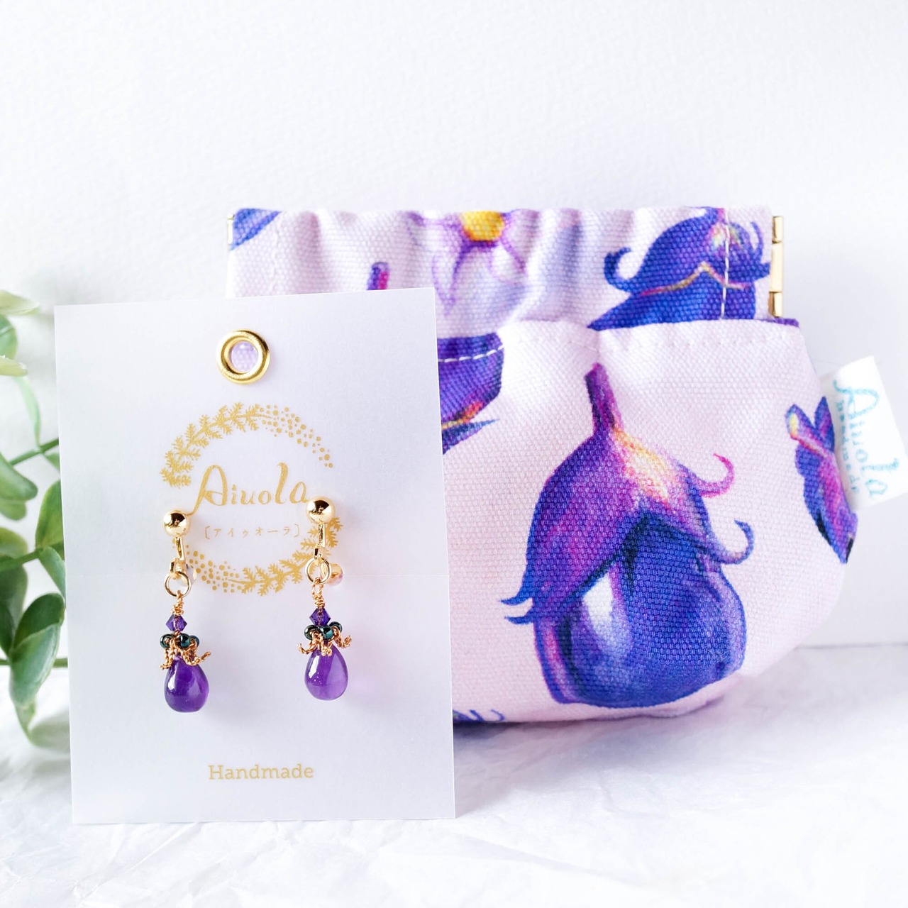 水彩色鉛筆で描いたイラストを元にデザインしたAiuolaオリジナル生地のバネポーチと、キラキラと小さなナスの形をしたアメジストのイヤリング・ピアスのセットです。