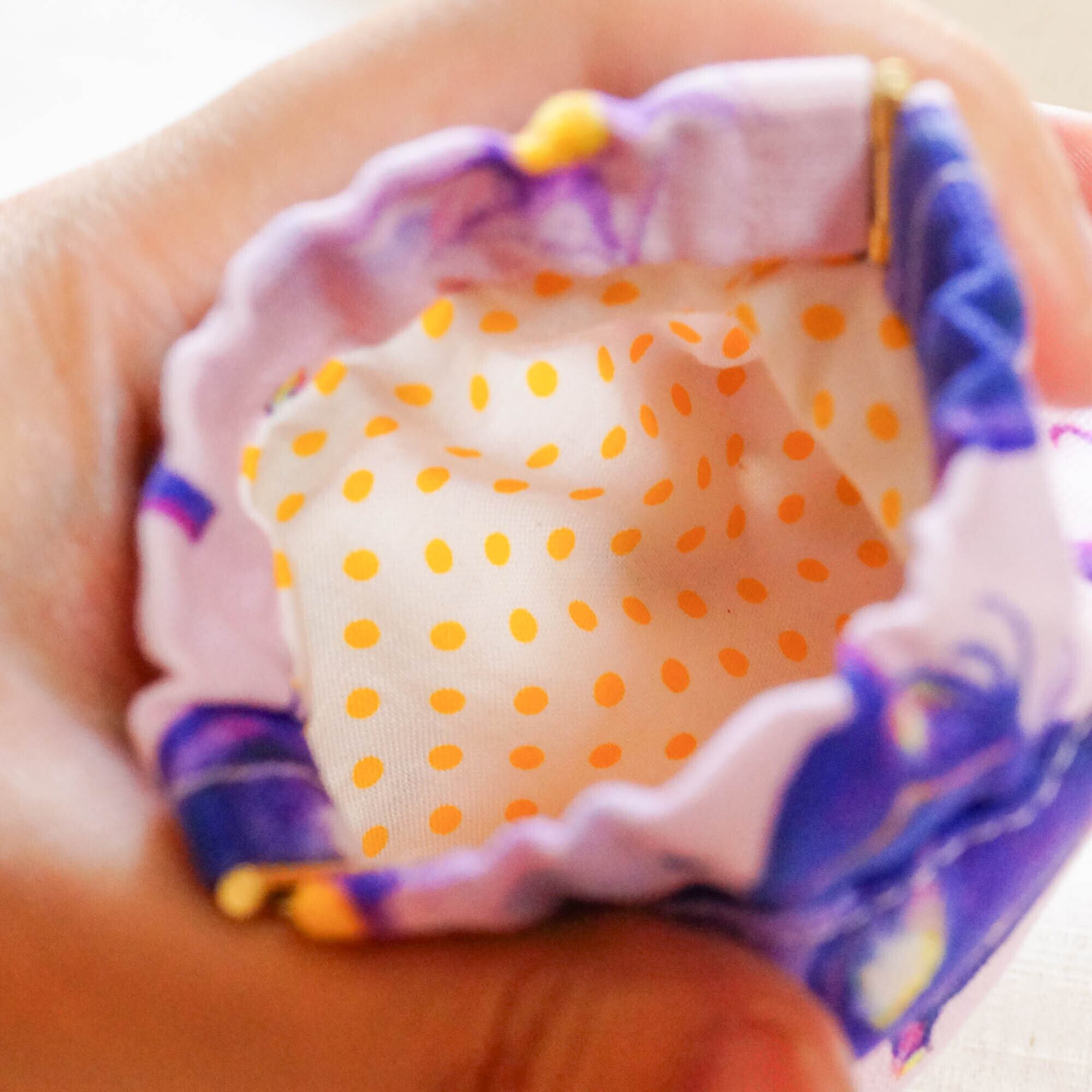 裏地は元気なオレンジのドット柄、バネ金具は安心の日本製です。