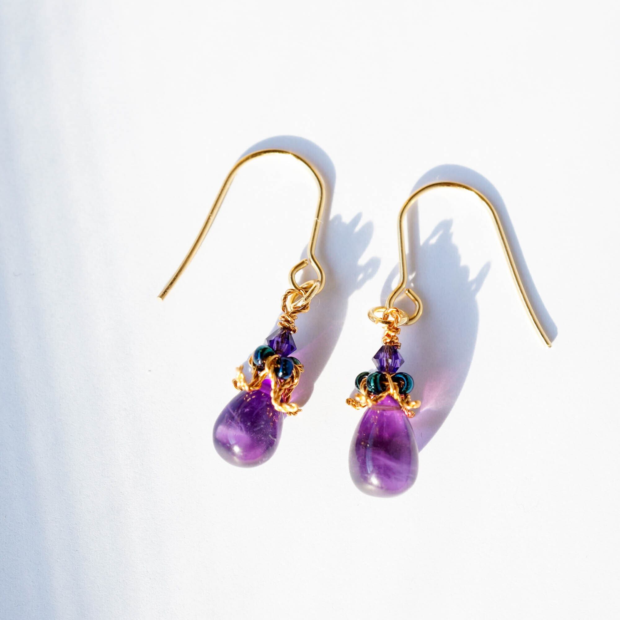 耳飾りはつるんとしたザンビア産のアメジストを使用しています。