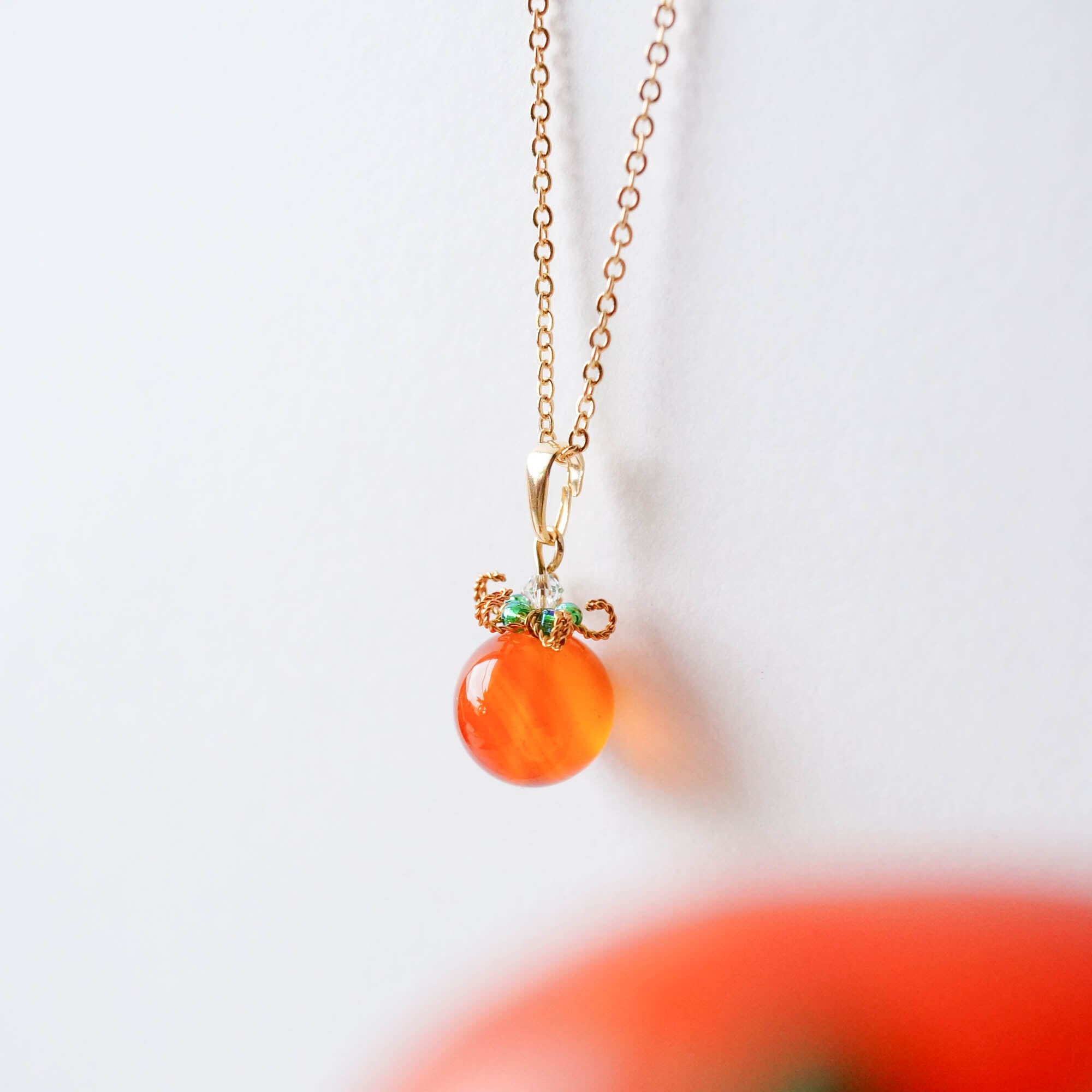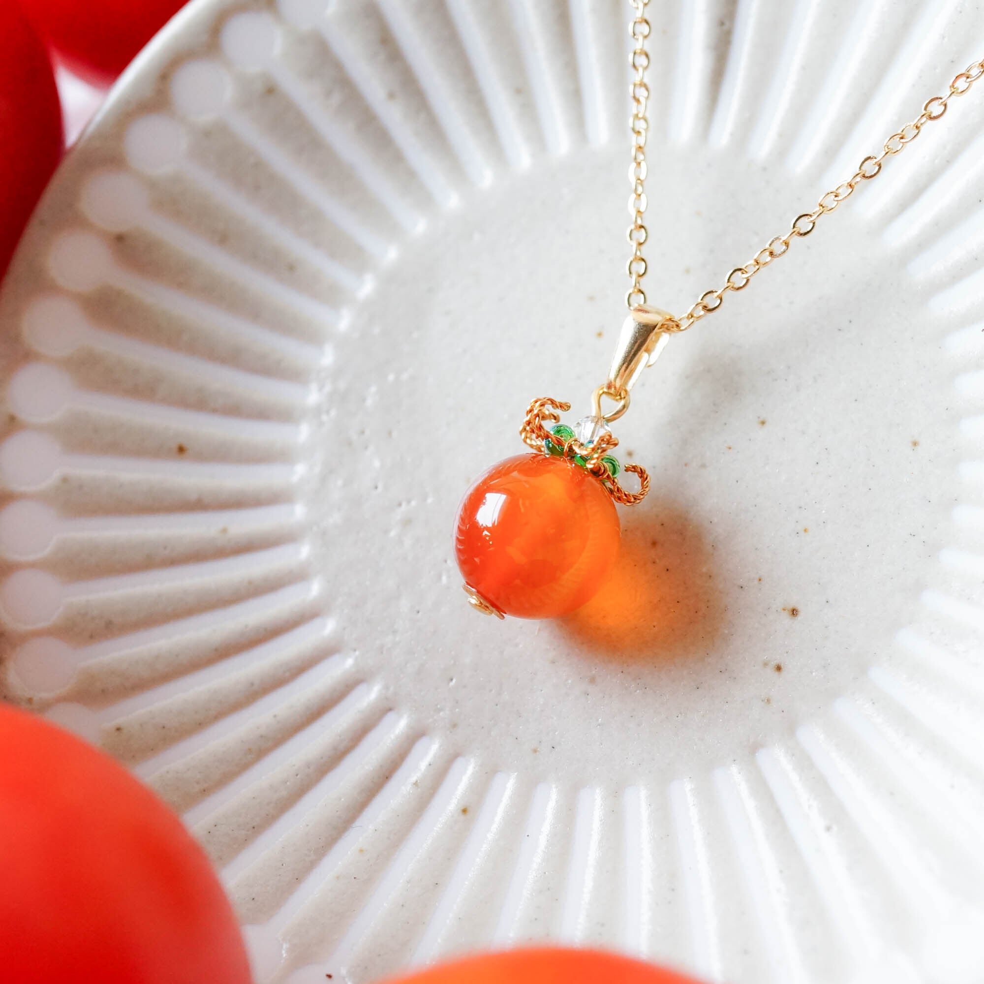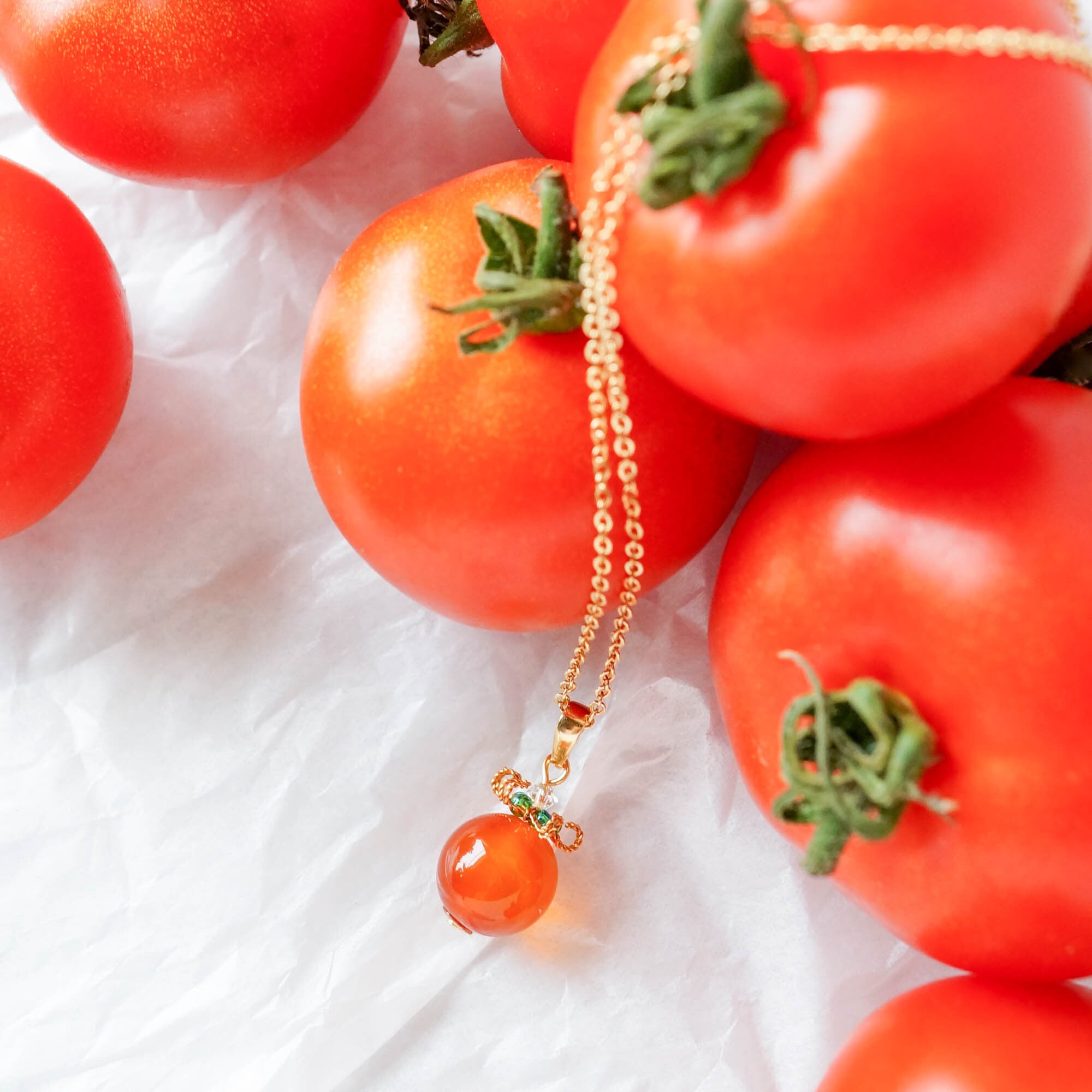 大粒12mmのカーネリアンを、つるんとみずみずしいミニトマトに仕立てました。