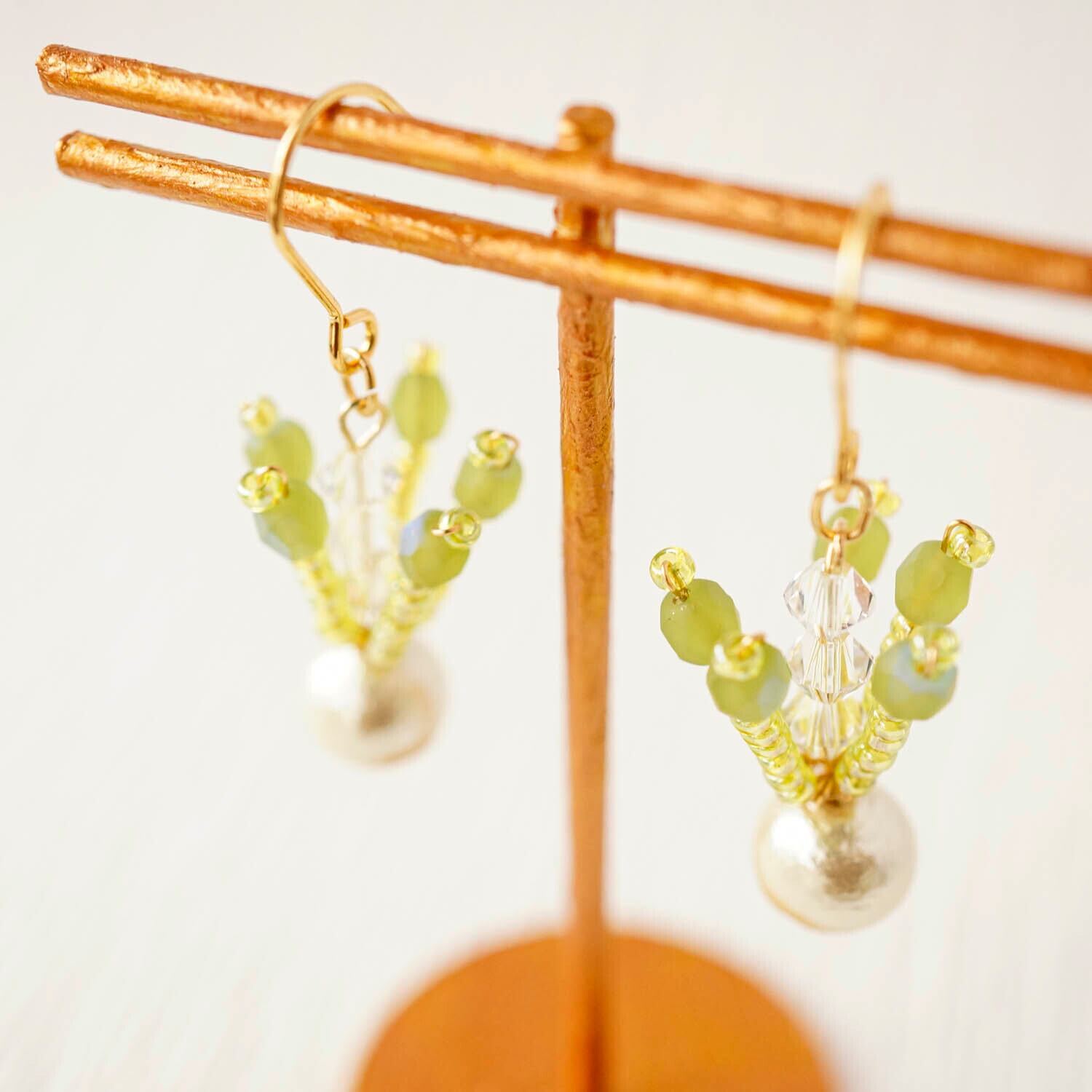 オリーブマットカラーのチェコビーズなどを葉っぱ部分にあしらいました。